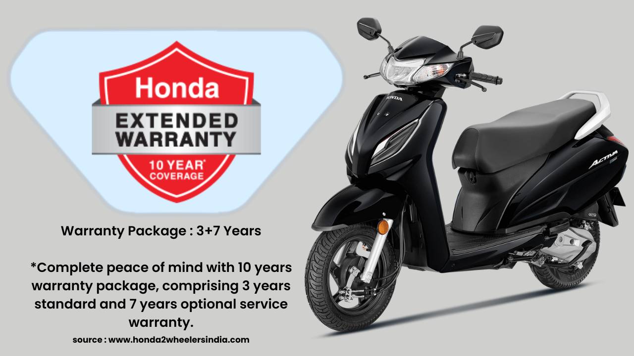 होंडा की तरफ से सभी बाइकों और स्कूटर में एक अच्छी वारंटी देखने को मिल जाती है तो यहां पर एक्टिवा में 3 साल की स्टैंडर्ड वारंटी मिलती है साथ ही यहां पर कुछ पैसे देकर अगर आप चाहे तो आप इसे 7 साल तक बढ़ा सकते हैं | तो कुल मिलाकर होंडा की एक्टिवा पर भी हमें 10 साल की वारंटी देखने को मिल जाती है | यह होंडा की एक ऑप्शनल सर्विस है |